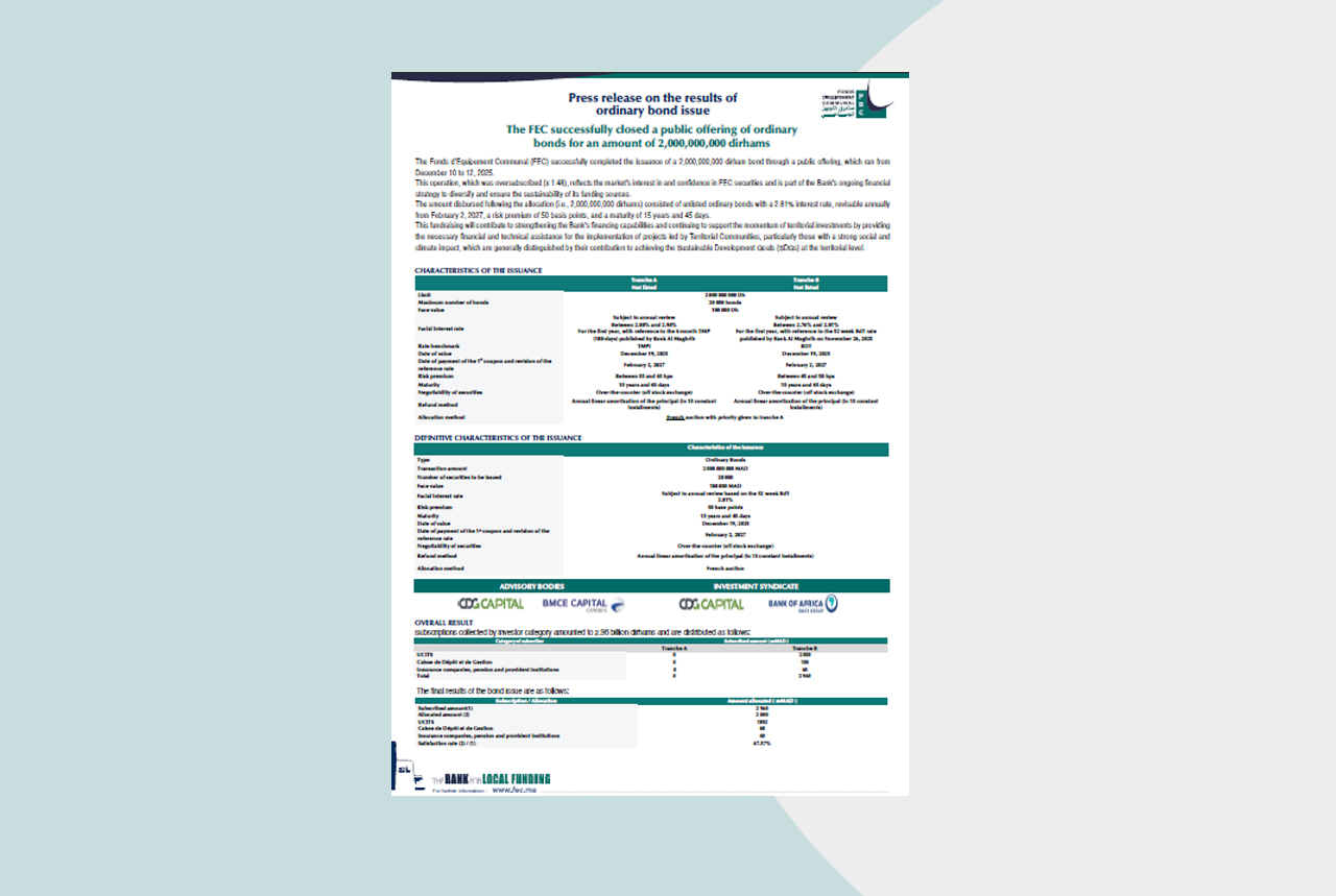 The FEC publishes a press release on the occasion of the result of a bond issue for an amount of 2 billion dirhams.